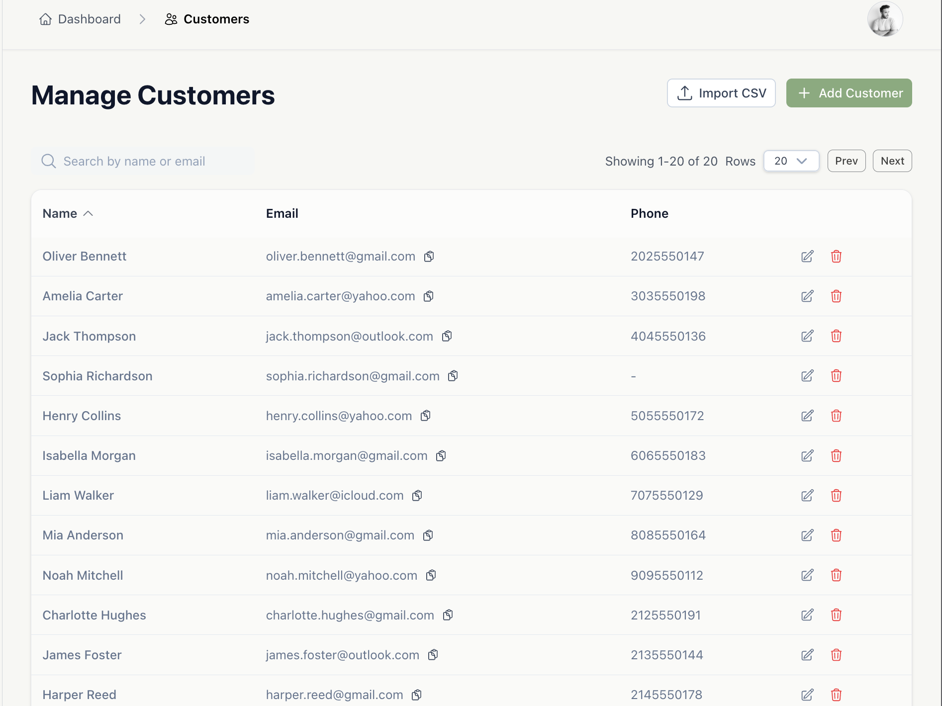 Keep track of every customer, their subscription plan, and projected revenue. Import from a CSV file or add them individually.