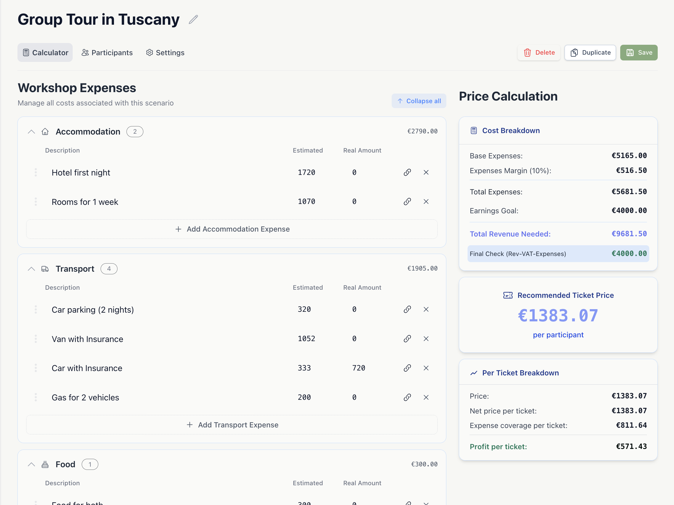 Create financial scenarios without touching a spreadsheet. Add customers, set pricing tiers, define expenses, and see instant margin calculations — all from one clean interface.